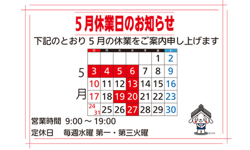 営業時間 9:00~19:00 定休日 水曜日 第1・ 第3火曜日